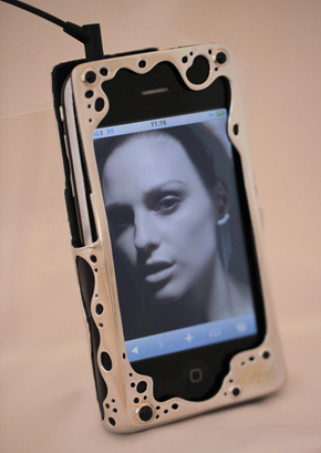 Sterling silver, rhodium plated case with Onyx setting and black leather inside. Unique piece made for your 3G Iphone.
